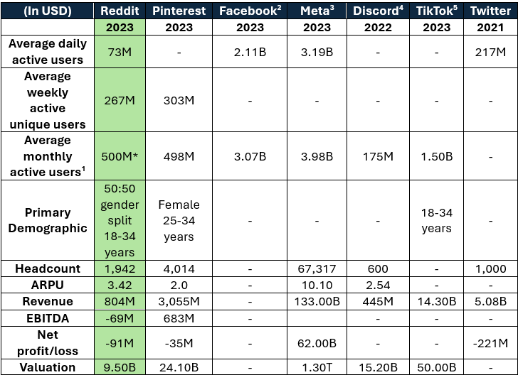 Reddit’s monthly active users (2023) is 2.8x that of Discord (2022). However, the valuation of Reddit (2023) is 0.63x that of Discord (2022). However, this is not a total like to like comparison since there would be PE inflation between 2022 and 2023. The other caveat is that Discord’s business model is fundamentally different from Reddit as the former does not rely on Ad revenue vs Reddit which relies heavily on Ad revenue.